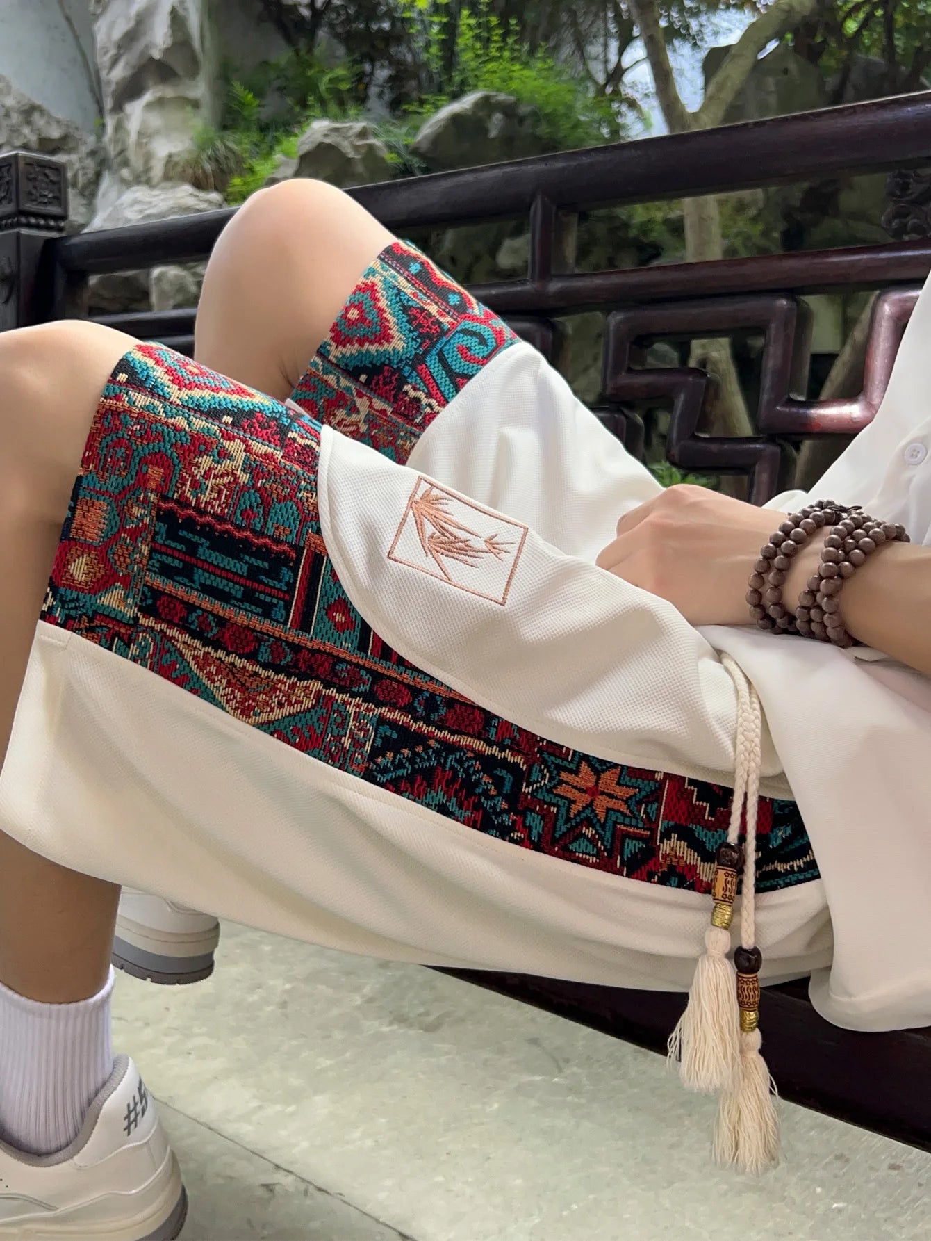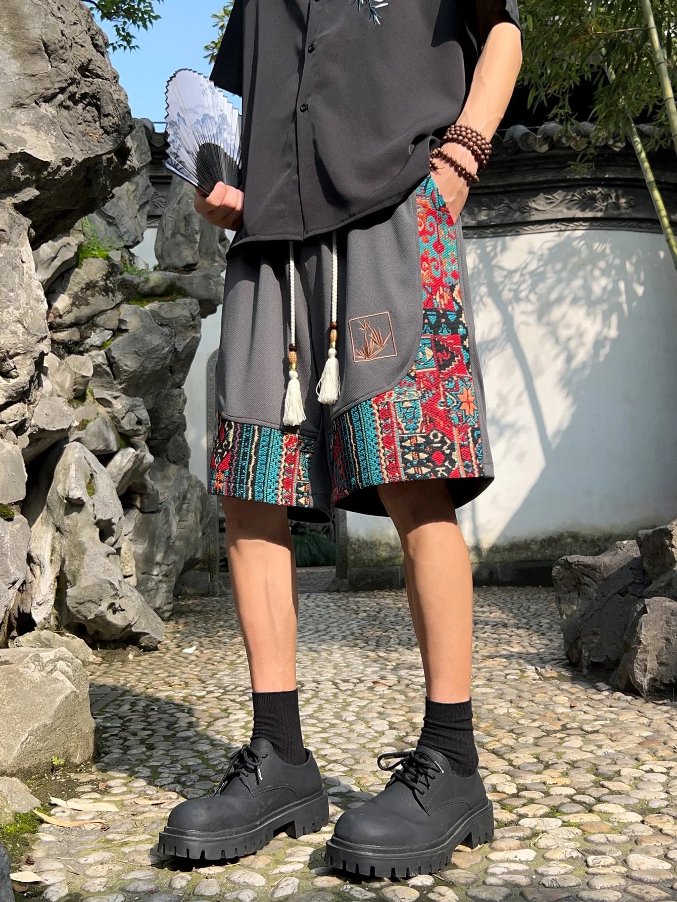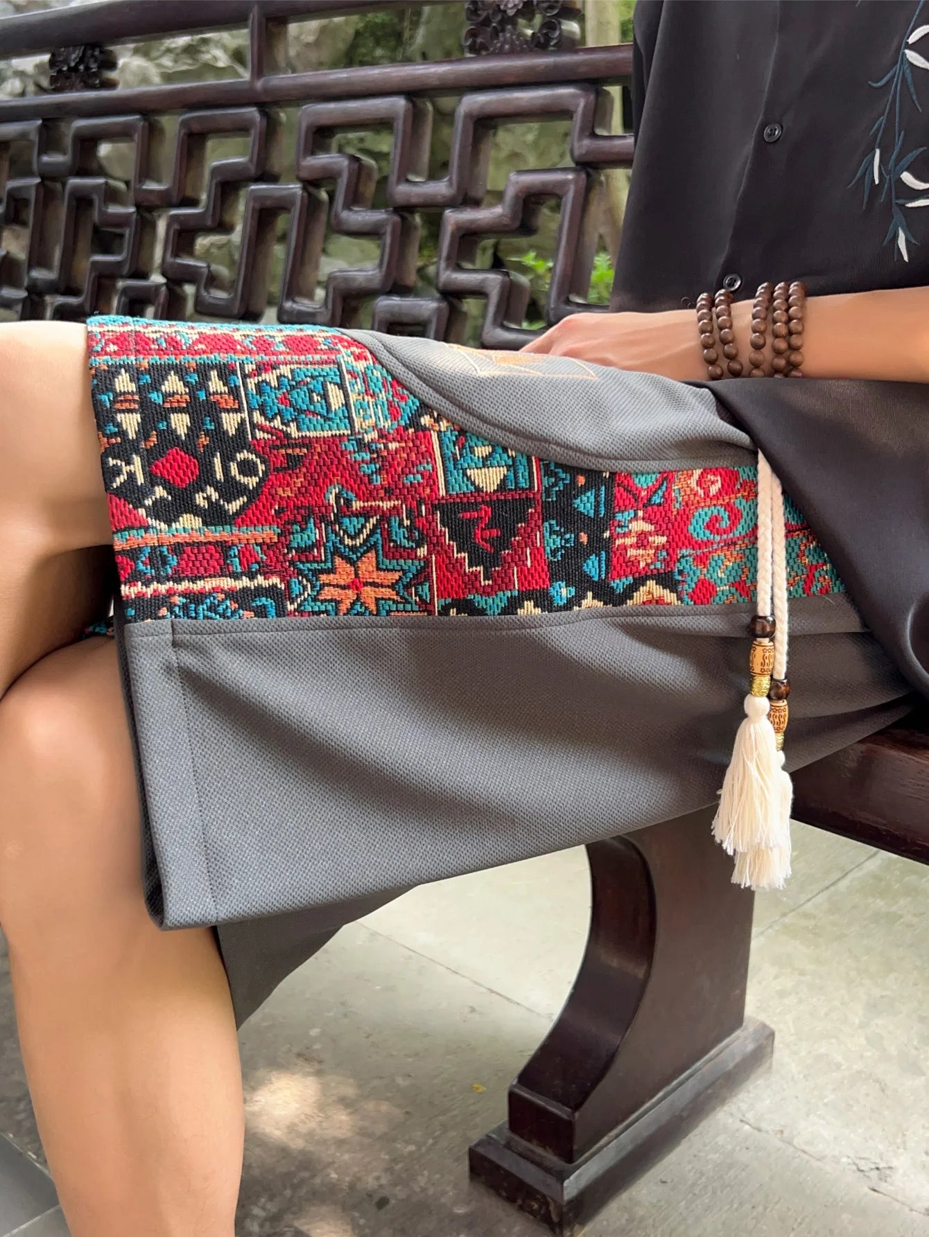 Colorful trims blaze along the edges, while roomy fabric and swinging tassels flow with each step. Deep pockets and rugged ease turn every stride into effortless style.