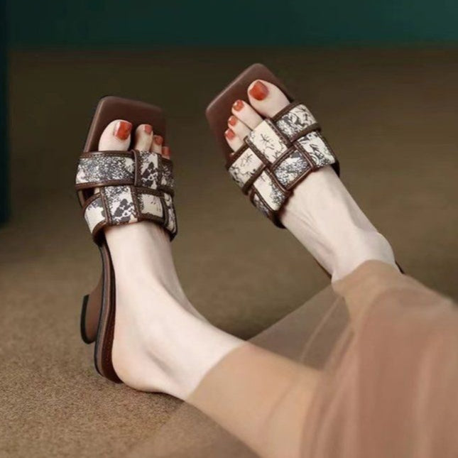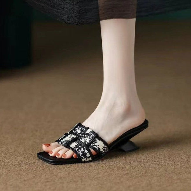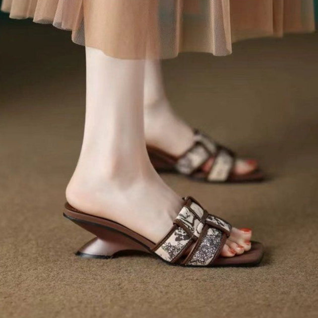 A sculptural heel lifts a padded footbed while double buckled straps in textured faux leather hug the foot. Square toe and soft lining keep things easy.