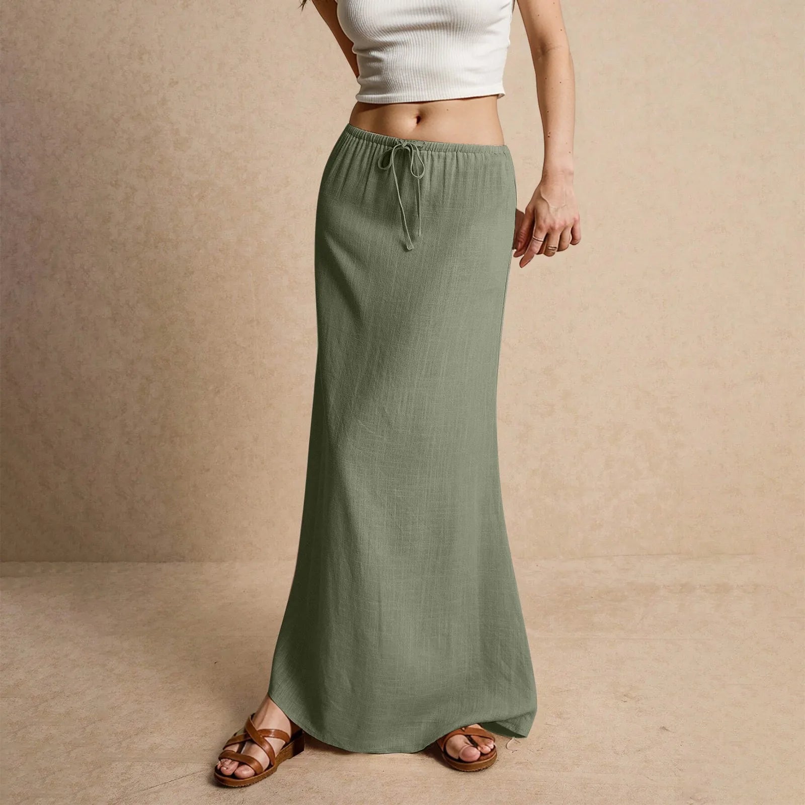 Made with a soft, lightweight weave, this maxi falls with a smooth drape that moves naturally. The adjustable drawstring waist lets you find your fit with ease, while the full-length cut gives it a streamlined look. A clean finish at the hem adds the final touch of refinement.